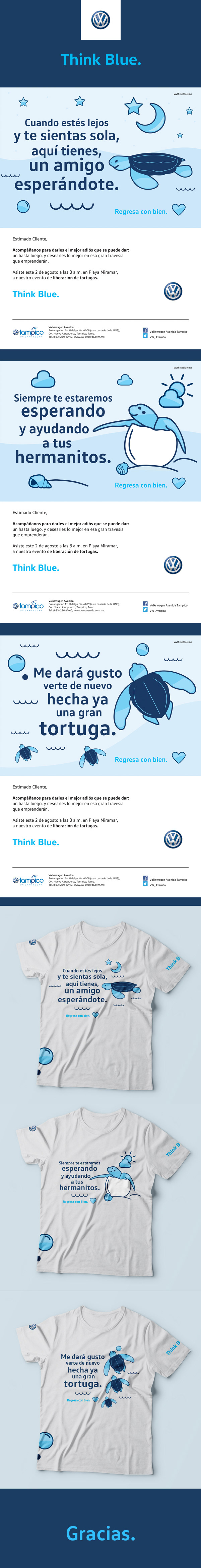 Desarrollo de ilustraciones y materiales para propuesta de concesionaria que ayuda a la liberación de tortugas. Todo el concepto va alineado a la imagen de Think Blue. Arrechedera Claverol.